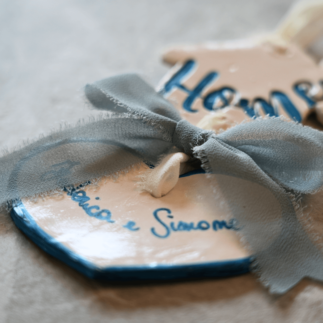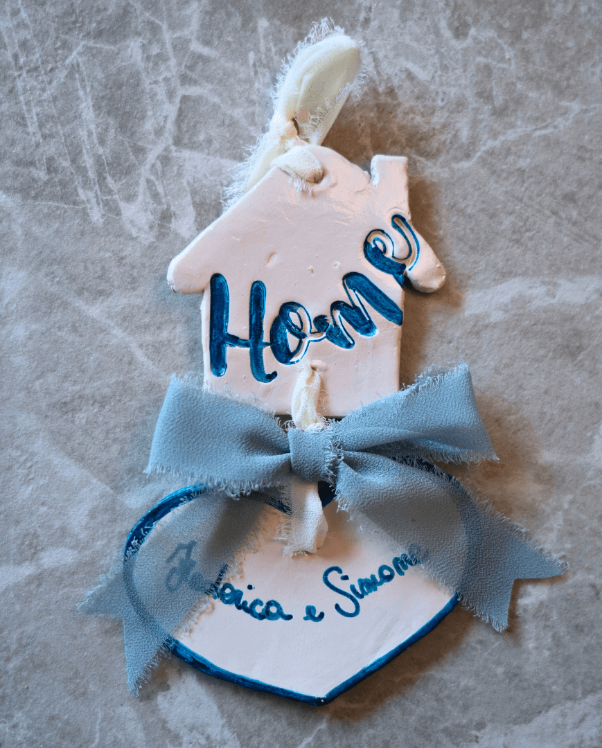 Questa piccola casetta in ceramica è fatta a mano, con un cuore e i vostri nomi.